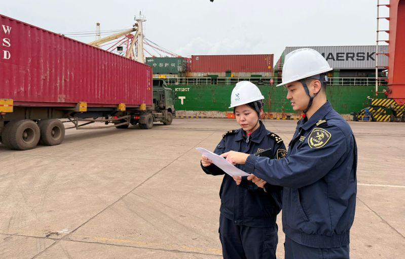 圖為:海關關員對內支線貨物進行現(xiàn)場監(jiān)管 李想/攝